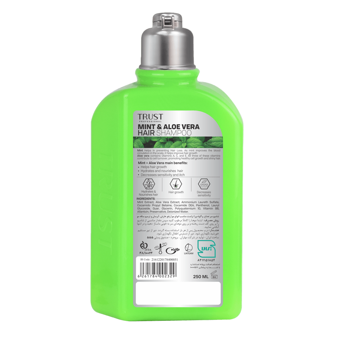 شامپو سر نعناع و آلوئهورا تراست، با وجود عصاره نعناع در ترکیبات خود، خشکی و خارش پوست سر را برطرف کرده و با داشتن خواص ضدباکتریایی و ضدقارچی، از بروز قارچهای ایجادکننده شوره جلوگیری میکند. همچنین آلوئهورا موجود در این محصول، ضمن آبرسانی پوست سر، موجب تغذیه و تقویت موها با ویتامینهای B12، E و C میشود.
