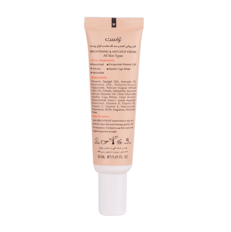 استفاده از ضد آفتاب برای محافظت از پوست جهت پیشگیری از بروز لکها امری مهم محسوب میشود. اما برای رفع لکهای پوستی، استفاده از کرمهای روشن کننده پوست گزینه مناسبی است. کرم تخصصی روشن کننده و ضد لک تراست دارای فرمولاسیونی تخصصی است و تحت لیسانس سوئیس تولید میشود. این کرم تخصصی یکی از بهترین انتخابهای ممکن برای رفع تیرگی و لکهای پوستی است. این محصول با برخوداری از ترکیبی بینظیر از مواد موثر روز دنیا مثل رزوسینول، آربیوتین، ویتامین E و C کپسوله و ملاوایت برای اولینبار در ایران تولید شد.