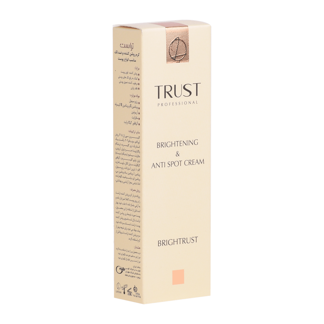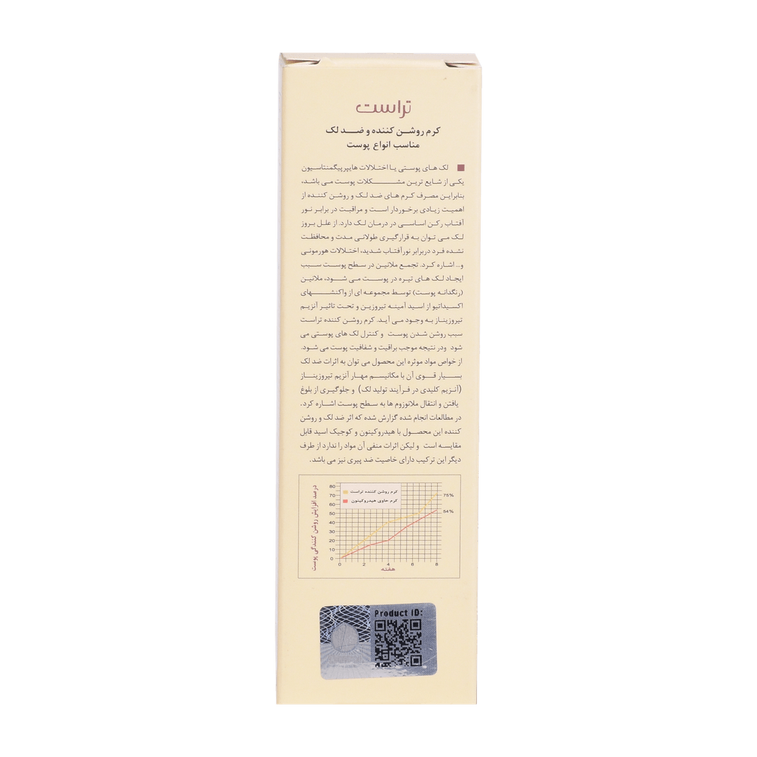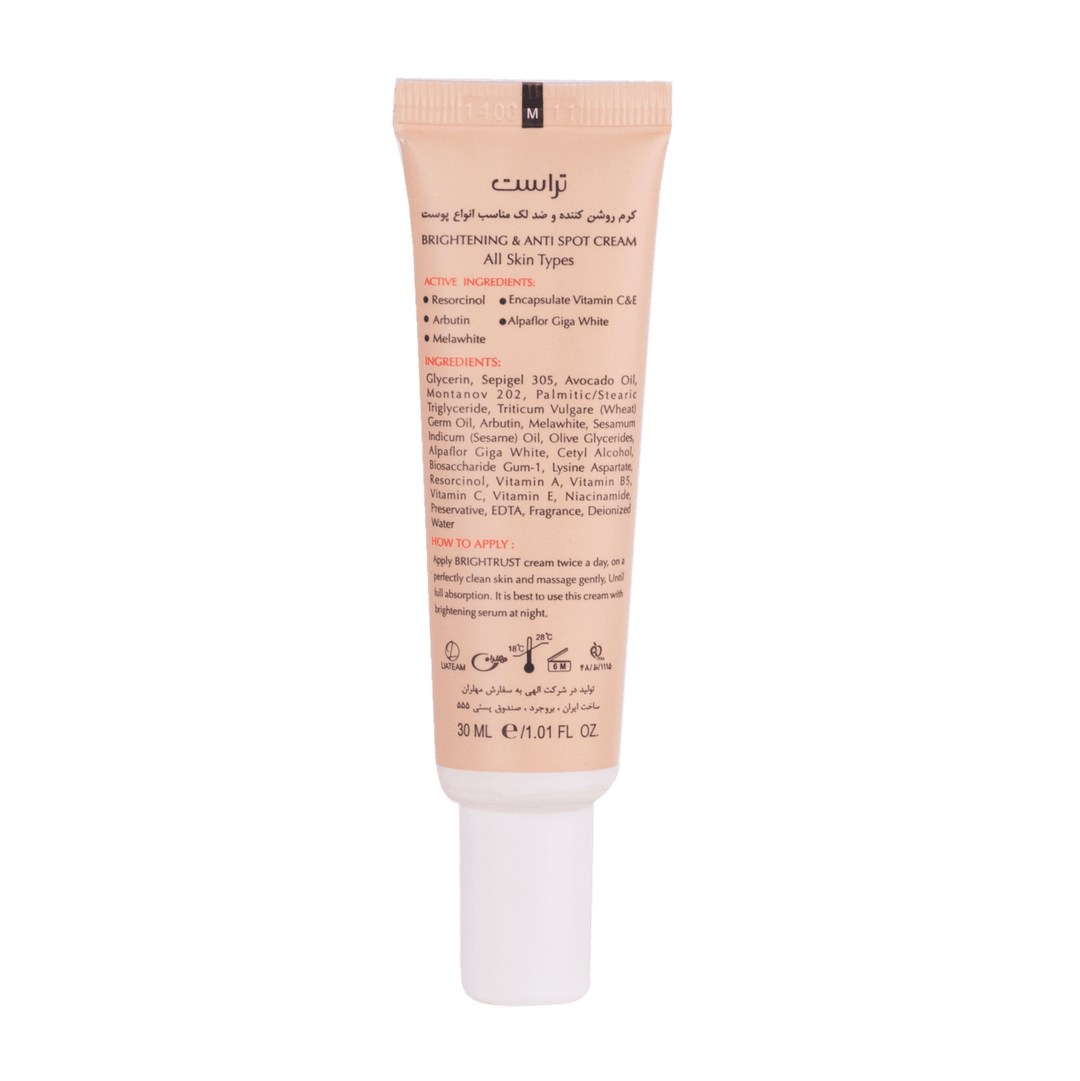 استفاده از ضد آفتاب برای محافظت از پوست جهت پیشگیری از بروز لکها امری مهم محسوب میشود. اما برای رفع لکهای پوستی، استفاده از کرمهای روشن کننده پوست گزینه مناسبی است. کرم تخصصی روشن کننده و ضد لک تراست دارای فرمولاسیونی تخصصی است و تحت لیسانس سوئیس تولید میشود. این کرم تخصصی یکی از بهترین انتخابهای ممکن برای رفع تیرگی و لکهای پوستی است. این محصول با برخوداری از ترکیبی بینظیر از مواد موثر روز دنیا مثل رزوسینول، آربیوتین، ویتامین E و C کپسوله و ملاوایت برای اولینبار در ایران تولید شد.