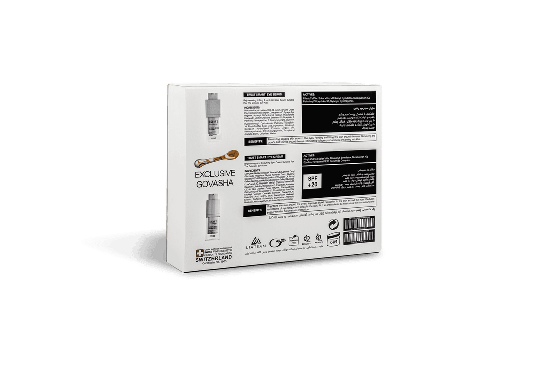 مهار کننده رادیکالهای آزاد و رفع چین و چروکهای سطحی دور چشم با داشتن ترکیبات آنتیاکسیدانی قوی مثل نیاسینآمید، روغن آرگان، syneye، عصاره سلول بنیادی دانه انگور، میتوکینیل، سیمدتوکس، کوآنزیم کیوتن و توکوفریلاستات افزایش استحکام و سفت کننده دور چشم با داشتن ترکیبات فعال پروتئین کلاژن هیدرولیز شده، کمپلکس سرامید، syneye، eyeregener، سیملیفت، Duraquench IQ، هیالورونیکاسید و روغن آرگان آبرسان عمیق پوست دور چشم با داشتن ترکیبات فعال هیالورونیکاسید، سیملیفت، دیپنتنول، آکواکسیل و Duraquench IQ جوانساز و برطرفکننده چین و چروکهای دور چشم با واسطه ترکیبات فعالی که به ساخت سلولهای جدید و رفع التهابات پوستی کمک میکنند، ترکیبات فعال syneye، eyeregener، عصاره سلول بنیادی دانه انگور و میتوکینیل پر کننده چین و چروکها و رفع شلشدگی و افتادگی پوست با داشتن ترکیبات پپتیدی سفتکننده و تغذیهکننده سلولهای پوستی syneye، دیپپتاید-۲ و پالمیتوئیل تتراپپتاید-۷ و پالمیتوئیل تری پپتاید-۳۸ مواد مؤثره سرم لیفت کننده و ضد چروک دور چشم تراست اسمارت