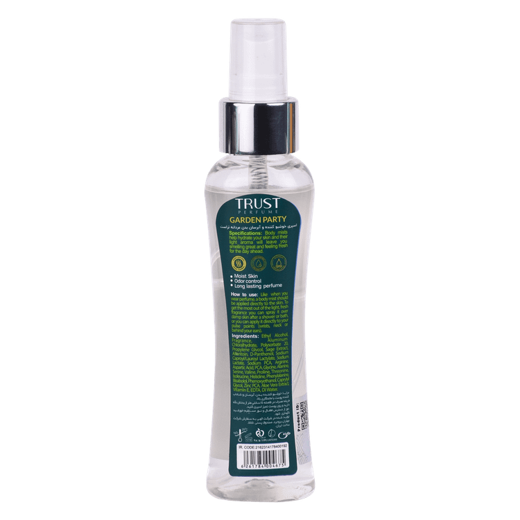 بادی میست مردانه تراست مدل Garden Party با گروه بویایی وانیل، آروماتیک،سبز و تند تازه در اختیار شما قرار میگیرد. با نتهای اولیه از وانیل ماداگاسکار، سروویرجینیا، سرو اطلسی، وتیور و خزه بلوط، این بادی میست با یک شروع جذاب به شما خوشآمد میگوید.